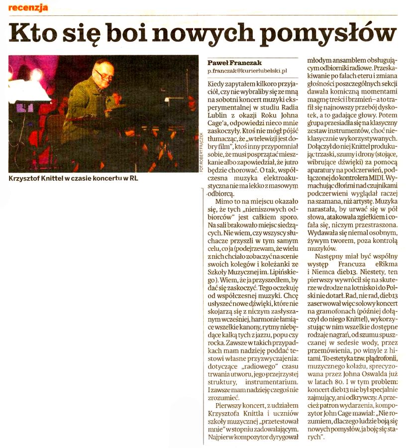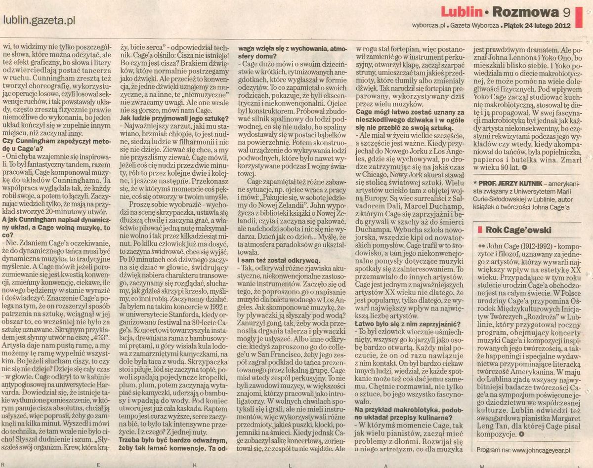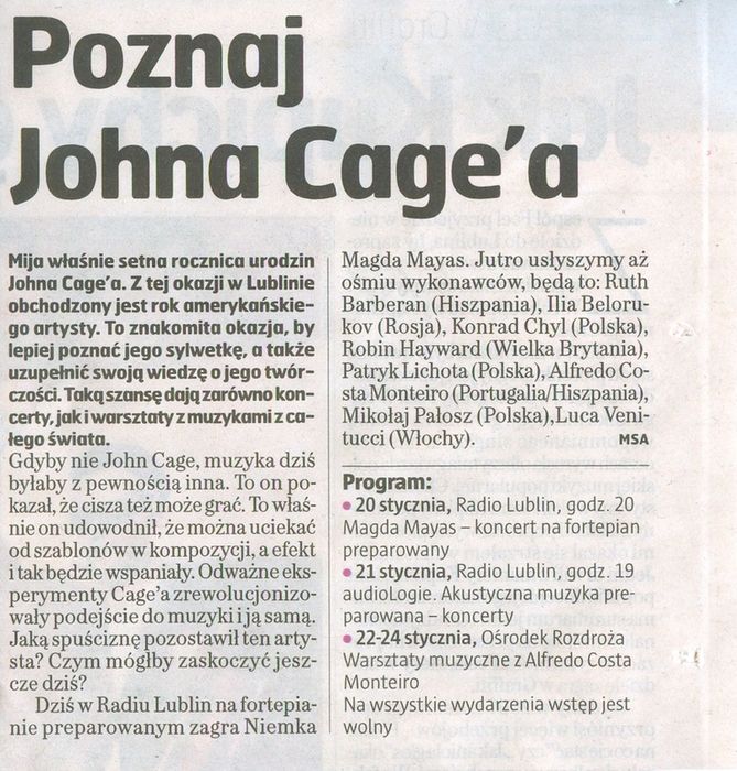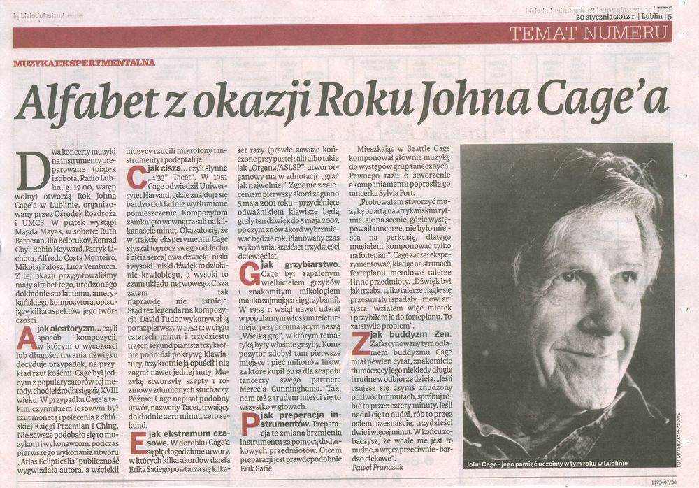 - „Alfabet z okazji Roku Johna Cage'a" Paweł Franczak, Kurier Lubelski 20 stycznia 2012