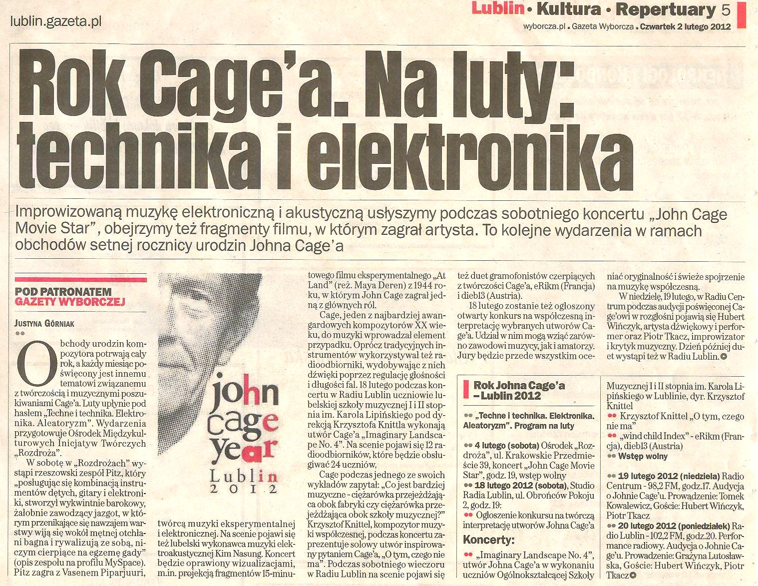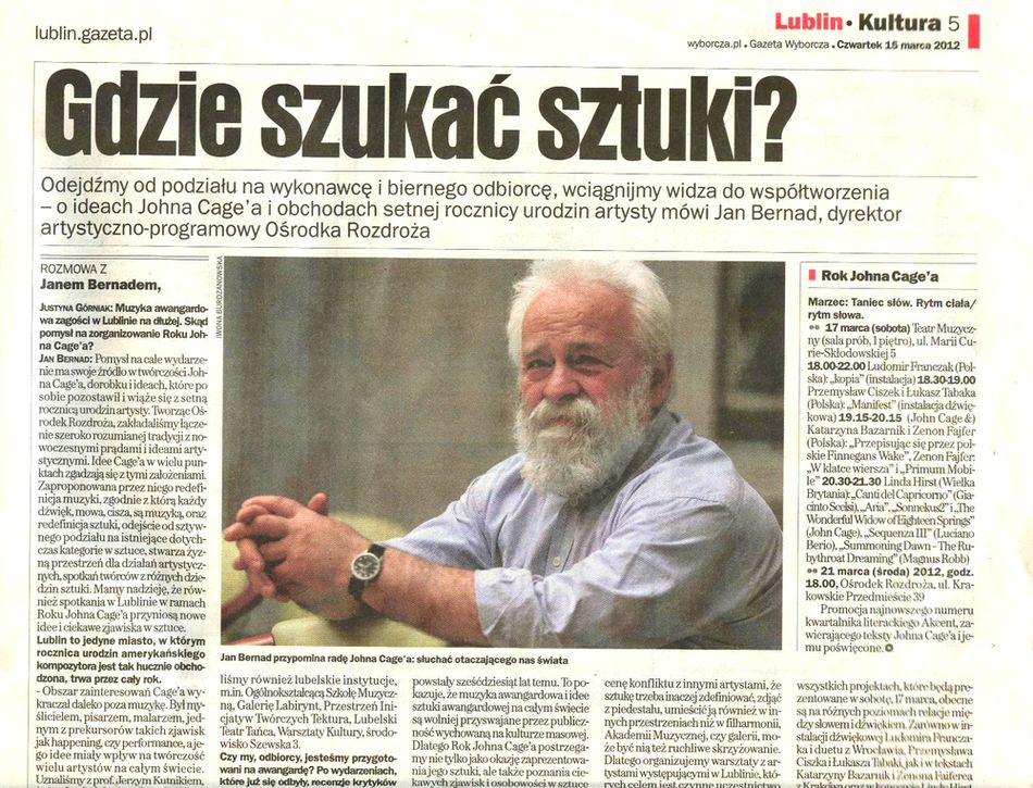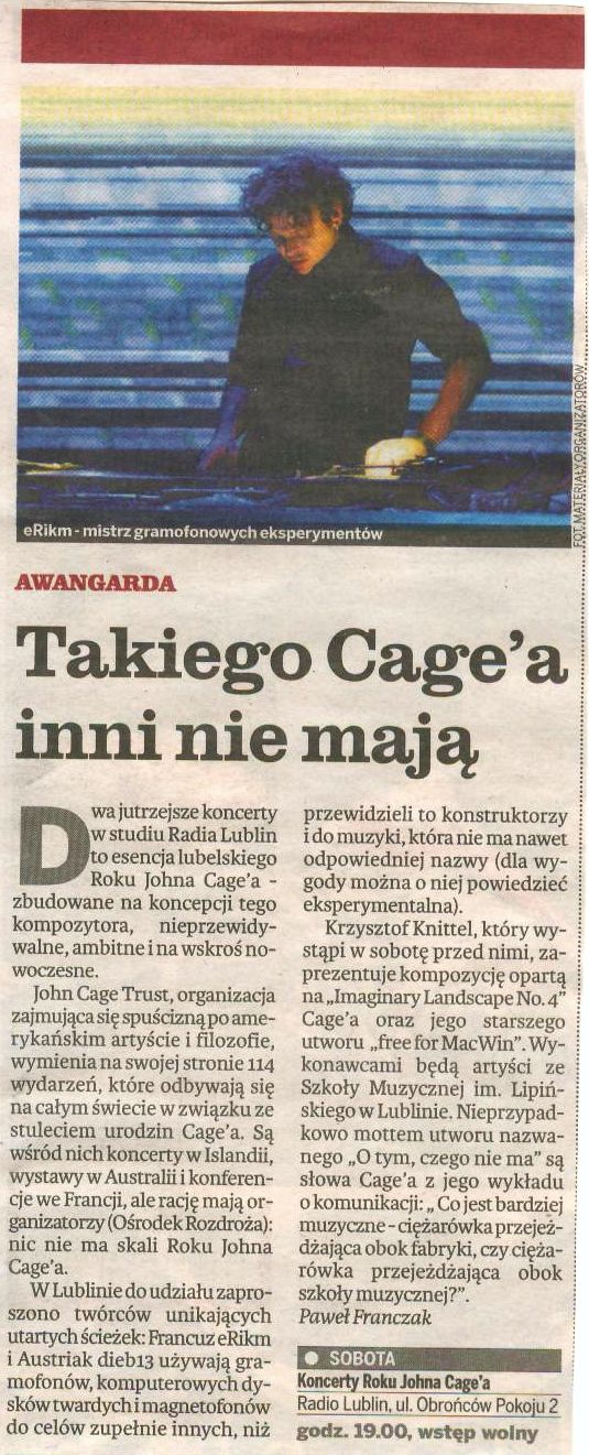 - „John Cage: Obraz, słowo i dźwięk" Paweł Franczak, Kurier Lubelski 16 marca 2012