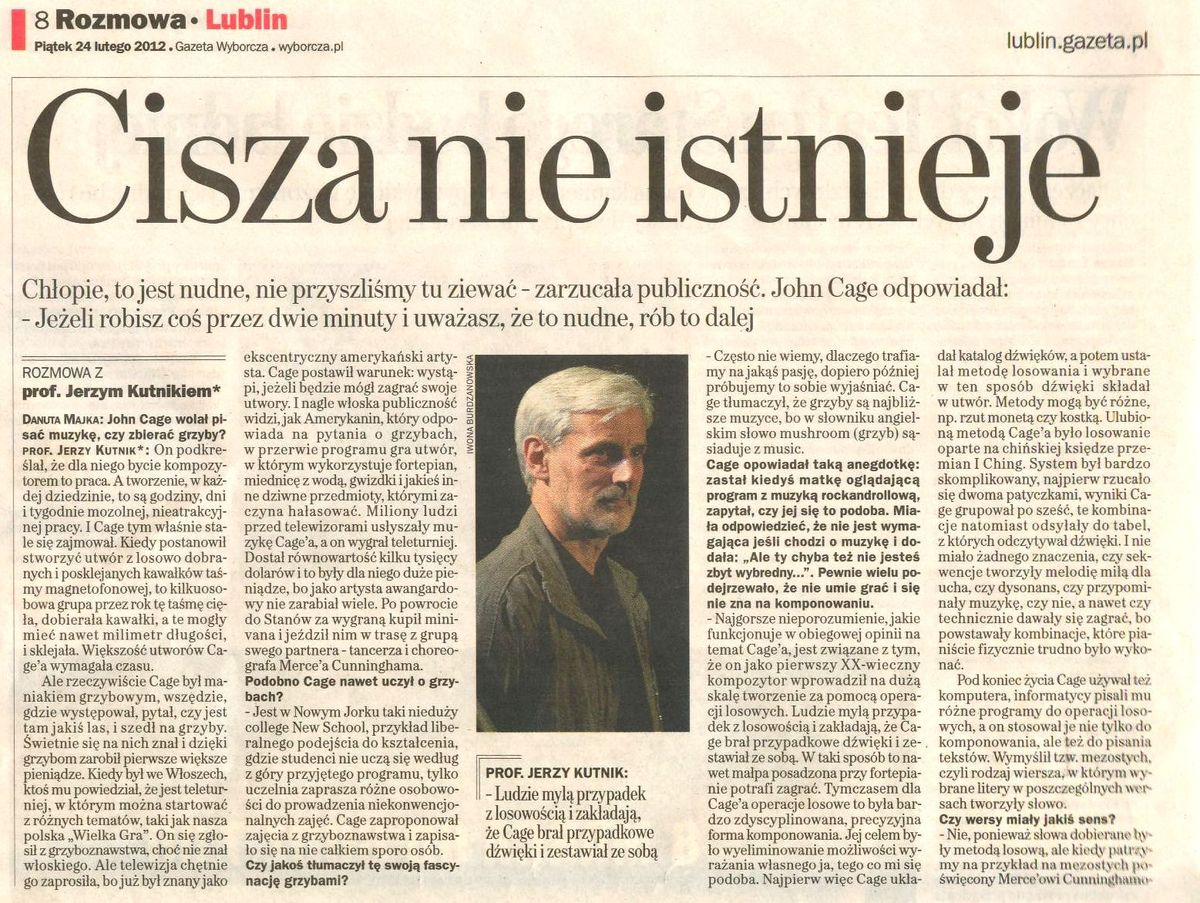 - „Cisza nie istnieje" - wywiad z Jerzy Kutnikiem przeprowadzony przez Danutę Majkę, Gazeta Wyborcza 24 lutego 2012 / cz.1